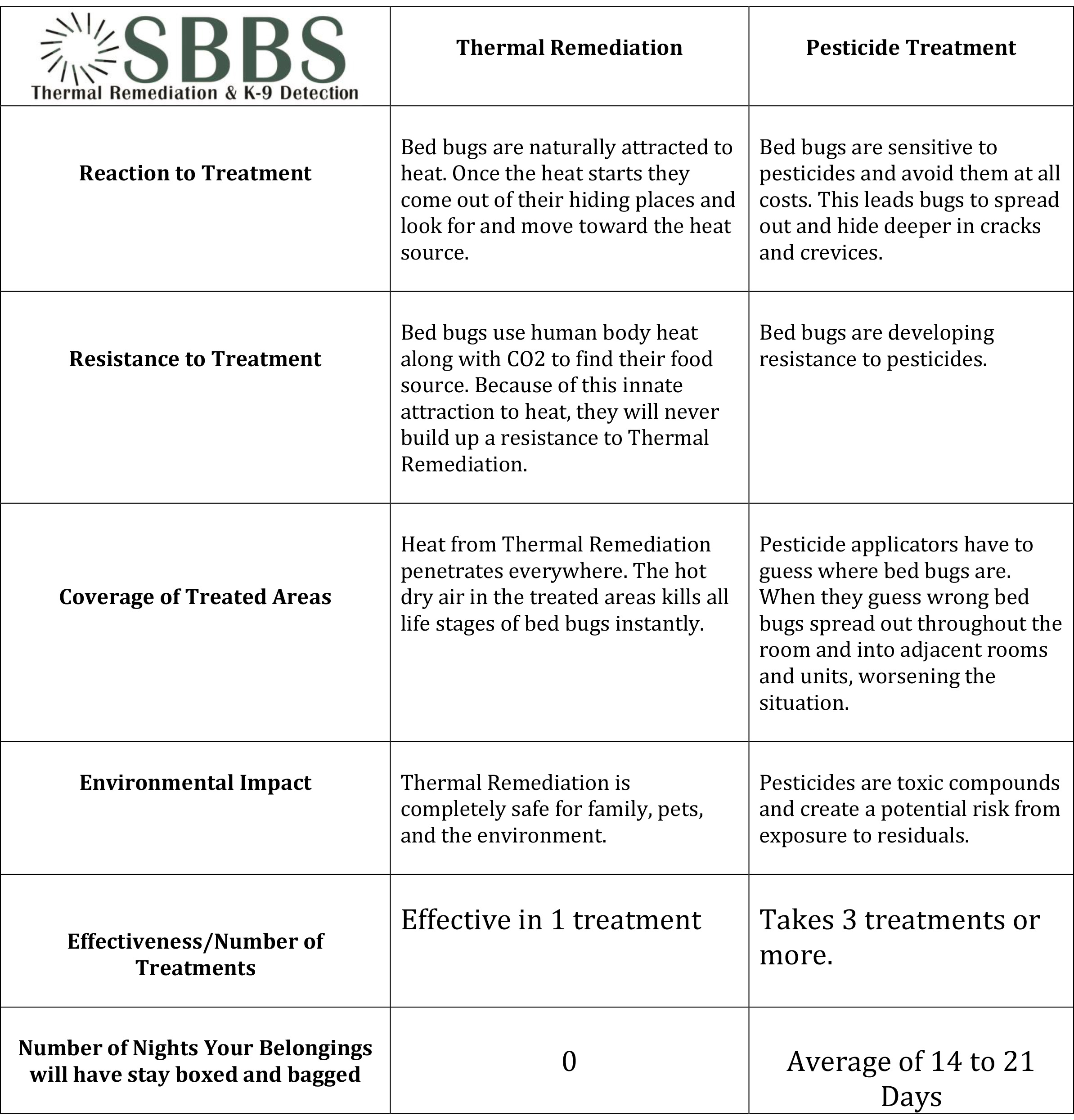 The bed bug will seek shelter on and in clothing. What are the benefits to heat treatments for bed bugs? Less prep work. Fewer pesticides are used, if any are used at The proper temperatures destroy bed bugs in minutes. A typical heat treatment for bed bugs is completed within 6-12 ... Document Viewer